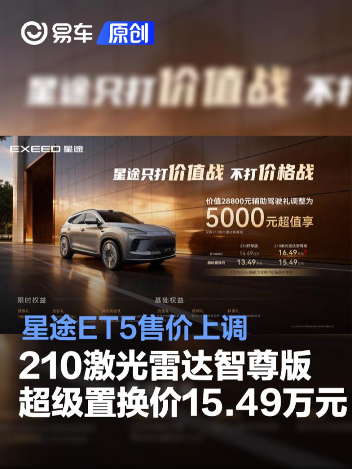 易车讯3月5日,星途汽车宣布上调官方指导价,其中210激光雷达智尊版车型上调5000元。调整后,该版本官方指导价为16.49万元,超级置换价15.49万元。