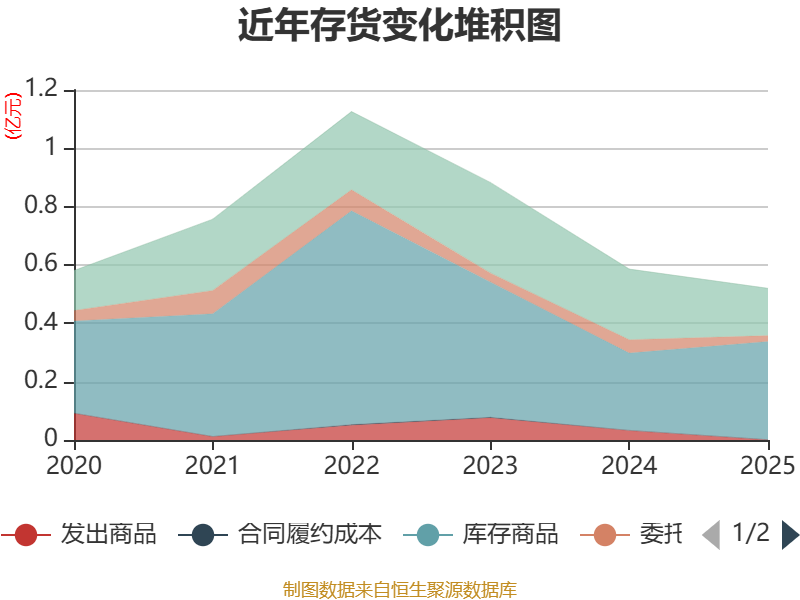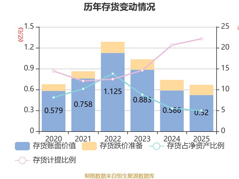 从存货变动来看,截至2025年末,公司存货账面价值为5202.14万元,占净资产的4.97%,较上年末减少660万元。其中,存货跌价准备为1479.61万元,计提比例为22.14%。