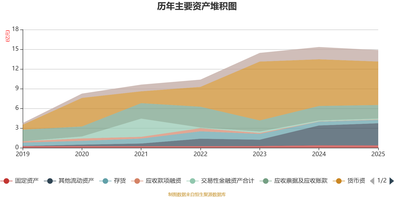 资产重大变化方面,截至2025年末,公司其他流动资产较上年末增加11.49%,占公司总资产比重上升2.95个百分点;其他非流动资产较上年末减少78.08%,占公司总资产比重下降2.51个百分点;货币资金较上年末减少6.82%,占公司总资产比重下降1.8个百分点;开发支出较上年末增加152.77%,占公司总资产比重上升1.17个百分点。