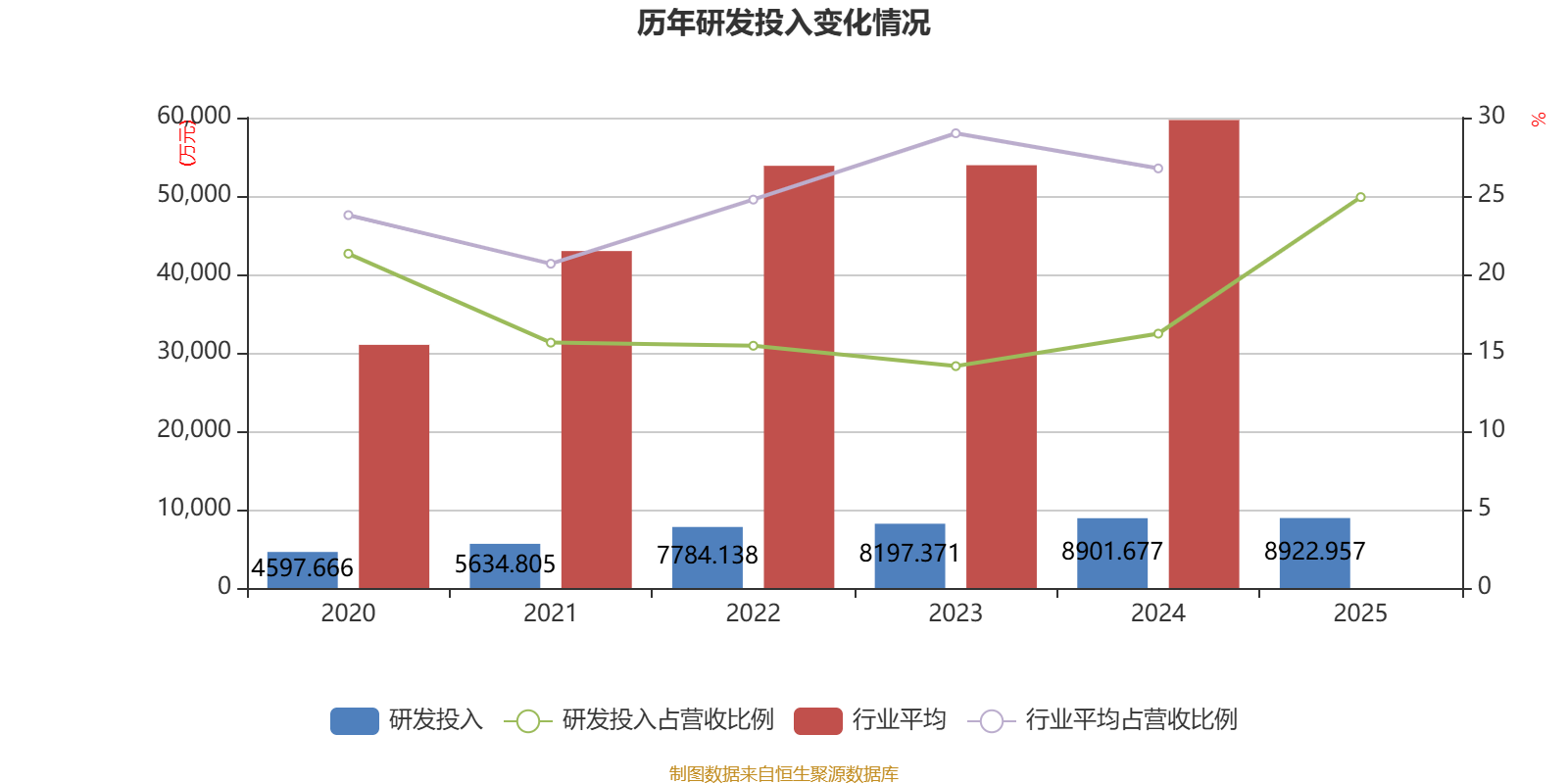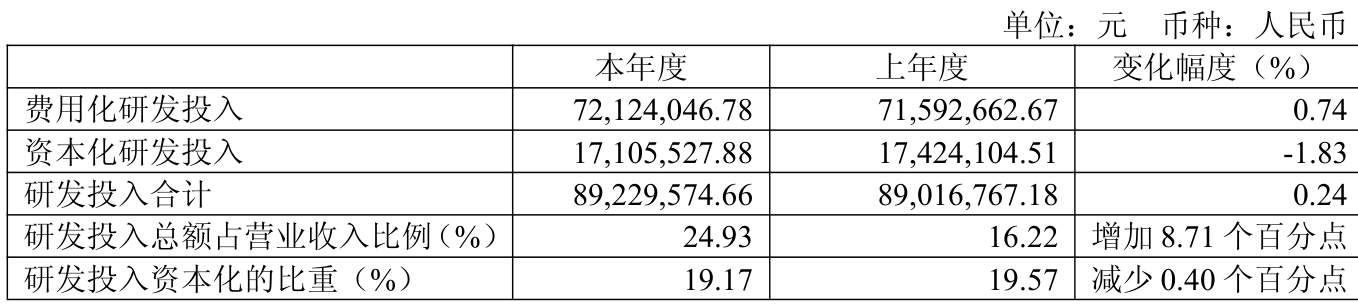 2025年全年,公司研发投入金额为8922.96万元,同比增长0.24%;研发投入占营业收入比例为24.93%,相比上年同期上升8.71个百分点。此外,公司全年研发投入资本化率为19.17%。